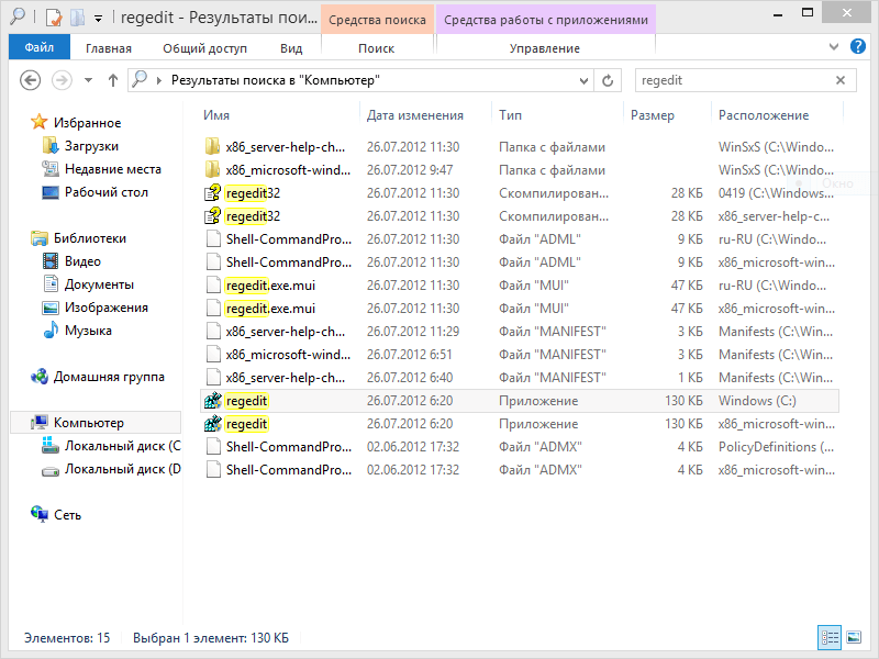 И так, всё по порядку: включаем свой ПК, на рабочем столе делаем два клика по иконке «Компьютер» и в открывшемся окне, в правом верхнем углу в строке «Поиск» набираем уже известное нам- regedit, и входим в редактор реестра, сделав клик по Приложению regedit размером 130 КБ, расположенном на диске С, (рис.1).