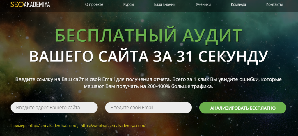 Аудит (речь пойдёт о его бесплатном варианте) происходит следующим образом: Вы заходите на сайт компании «SEO-AKADEMIYA», где размещён сервис «Бесплатного аудита», вводите адрес Вашего сайта и свой Email в поля белого цвета и делаете клик по зелёной кнопке с надписью «Анализировать бесплатно».