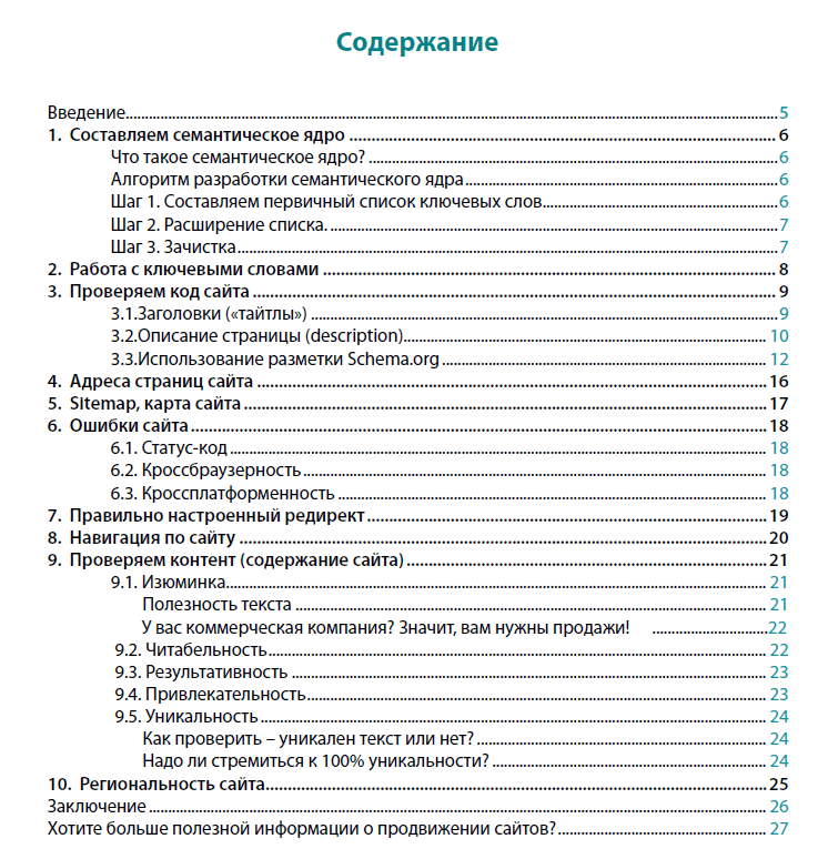 А ещё, Вы узнаете, как сделать в течение дня подготовку сайта к его продвижению и, как очень быстро, во-первых: выявить, а во-вторых: устранить все недостатки, влияющие на его продвижение в Интернет. Привожу скриншот оглавления книги, чтобы Вы увидели все разделы :